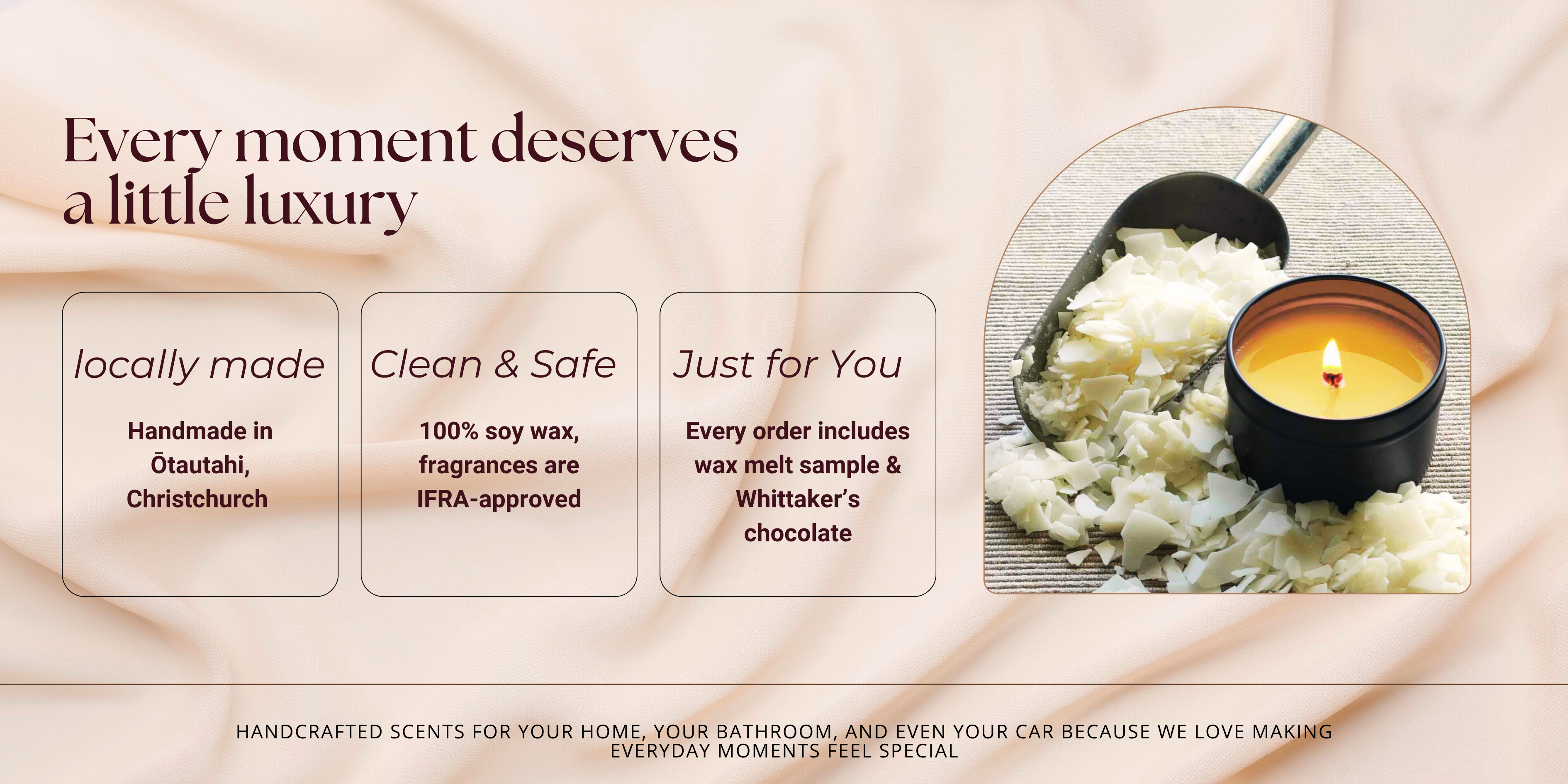 Each order is carefully packed with a wax melt sample and a Whittaker’s mini chocolate. plus a little discount for next time.